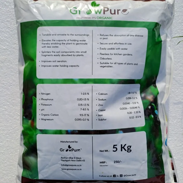 Grow Pure Manure is an excellent fertilizer rich in organic matter that helps to improve the biological, chemical, and physical properties of the soil. The worms break down soil and organic matter, so the nutrients are immediately available to plants. Vermicompost enhances plant growth, suppresses disease in plants, increases porosity and microbial activity in soil, and improves water retention and aeration.